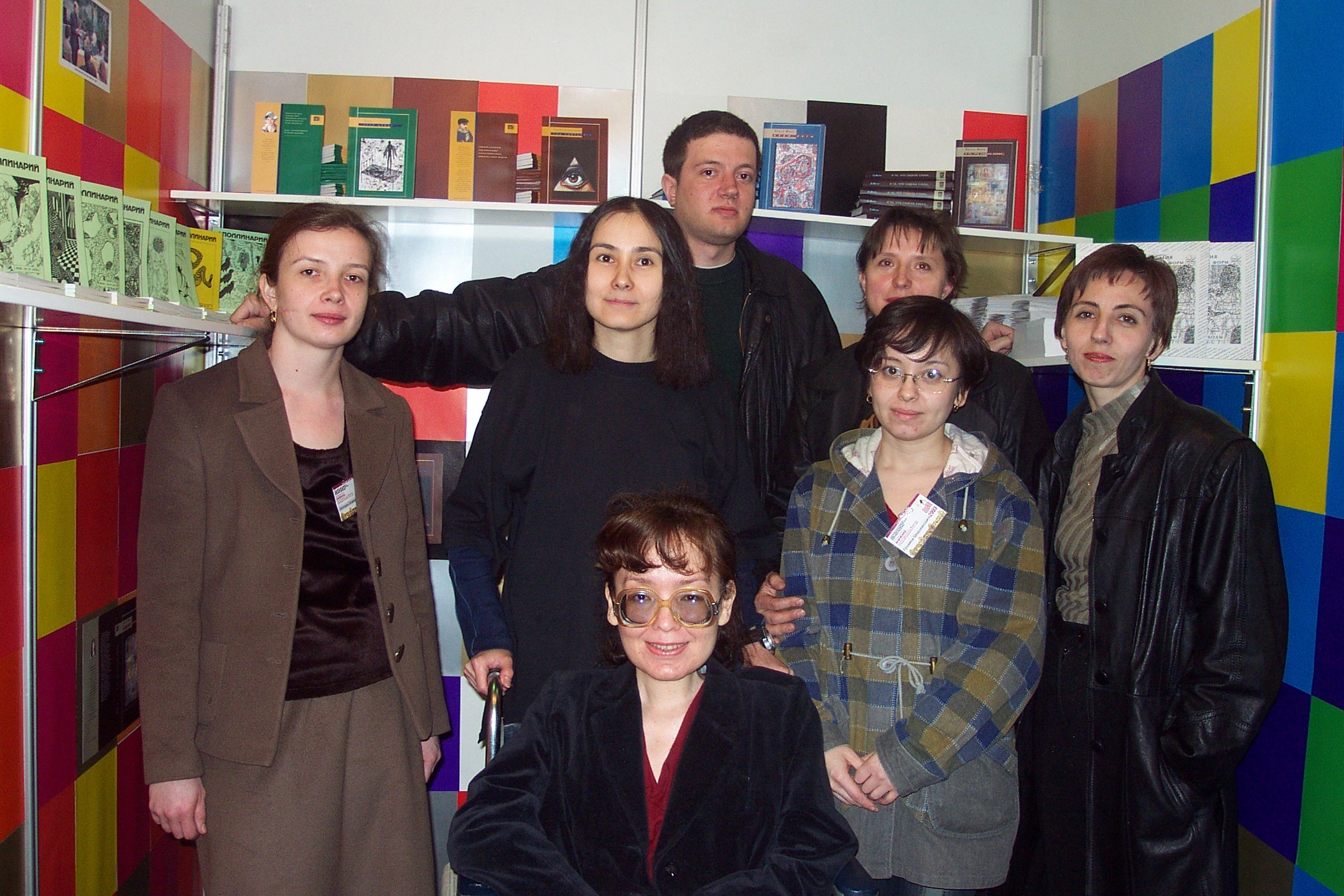 Olga Mark with her students (2002) and colleagues at a book exhibit (2003). Photo credits: Aigerim Tazhi and Alexei Shvabauer.