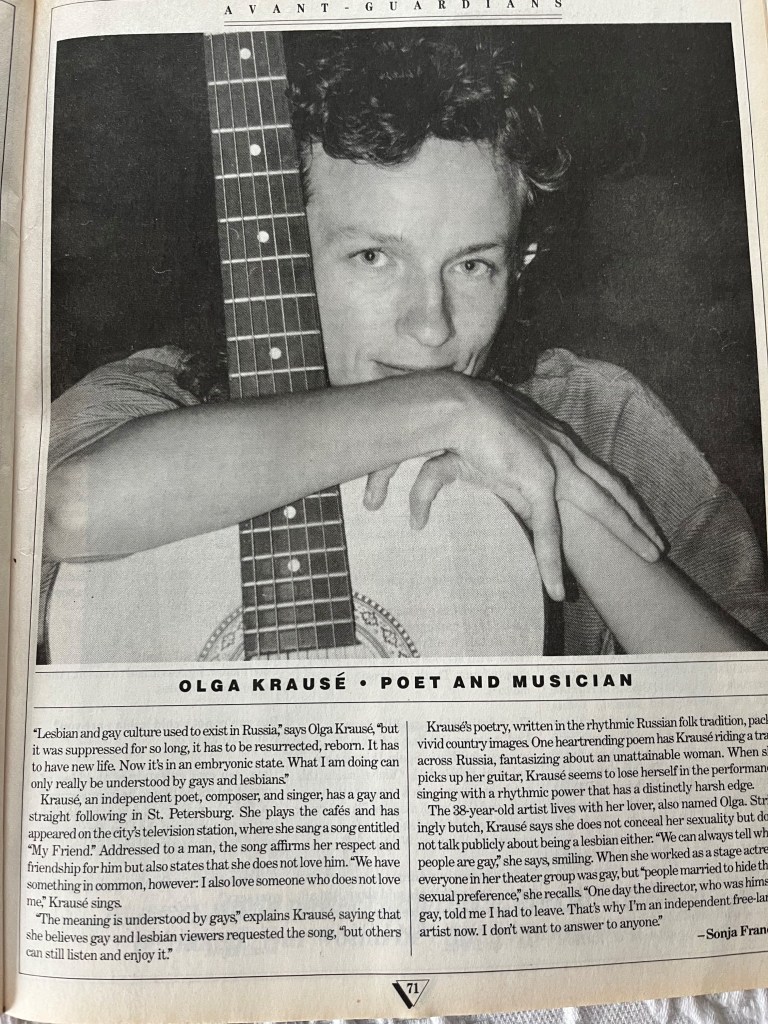 After that turning point, Olga Krauze continued to write and sing but grew bolder. She added queer activism to her work, first by helping to lead an organization with gay men called Wings and then by creating a support group for women, namely lesbians, called the Club of Independent Women. This queer activism was revolutionary for Russia, but it was perestroika and suddenly there were a lot of possibilities for lesbians and gays to come out of their closets.